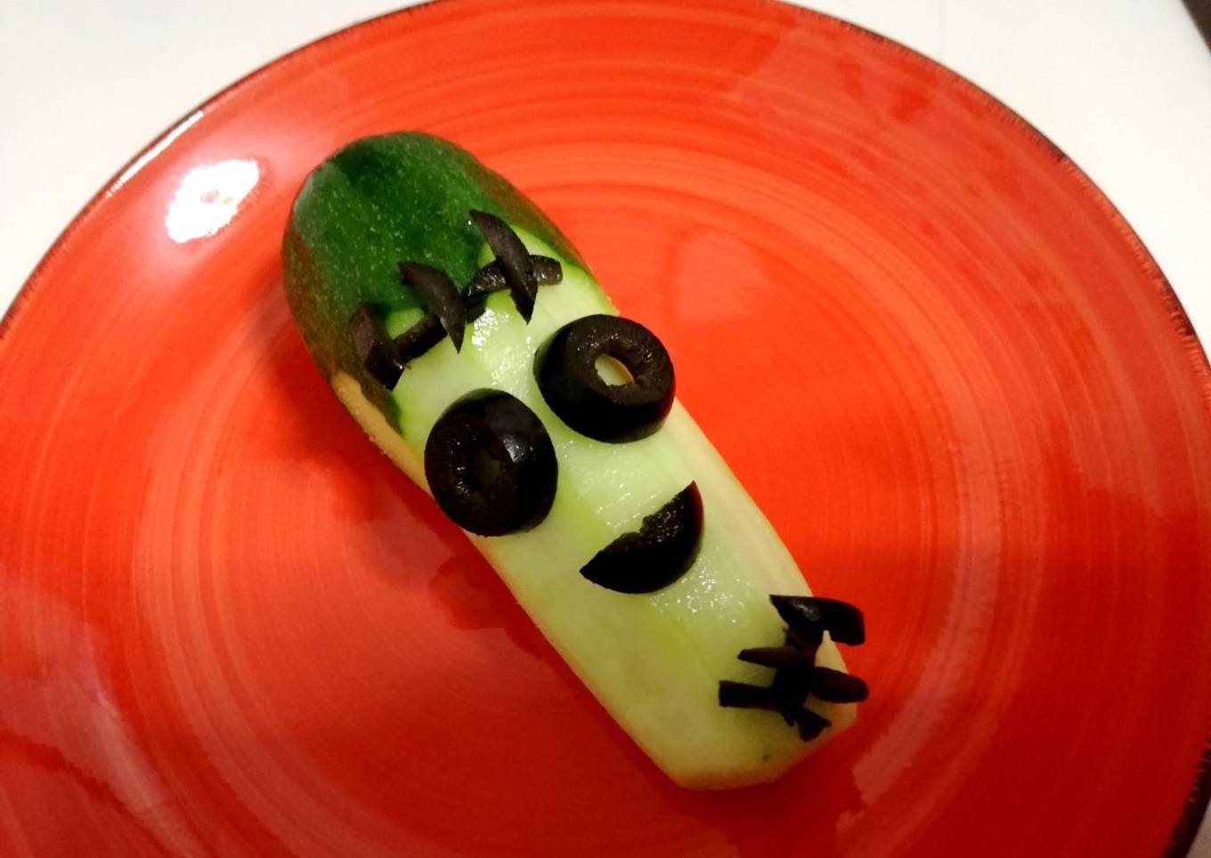Instructions to make to make Frankenstein de pepino y aceitunas (Halloween)