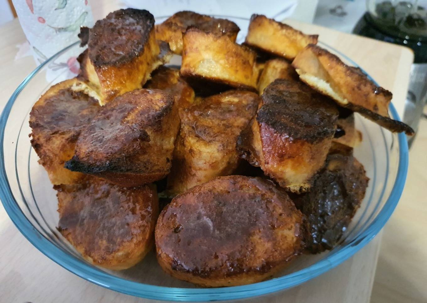 - Empapa las rebanadas de pan en leche y a continuación la pasas por el huevo. Vas poniendo las rebanadas en la bandeja como en la foto