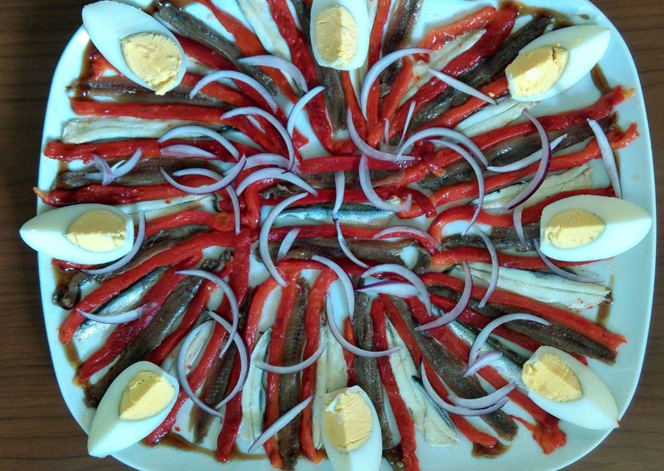 Ensalada de boquerones en vinagre, anchoas y pimientos asados