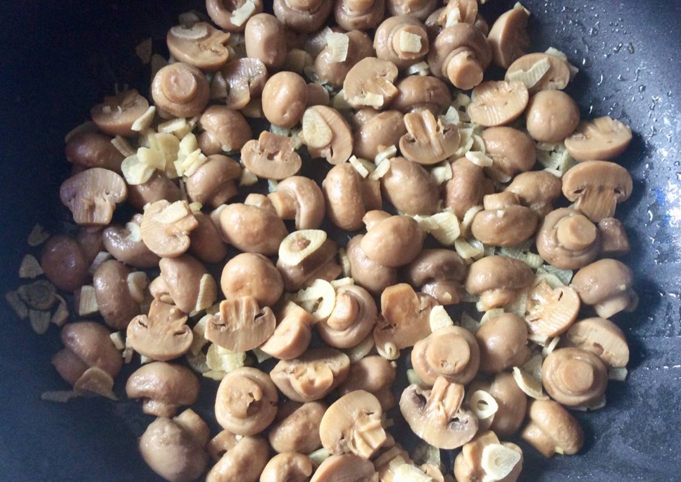 - En primer lugar picamos los ajos en láminas finas, los empezamos a sofreír con aceite de oliva virgen extra y transcurridos un par de minutos le incorporamos los champiñones mini cortando por la mitad los más grandecitos. Cuando empiecen a dorarse y con cuidado de que no se nos quemen los ajitos, añadimos la mitad del vino blanco, la sal y la pizca de pimienta.