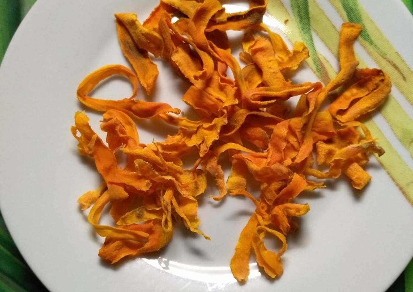 - En un plato poner papel vegetal y posteriormente poner la zanahoria en tiritas. Ponerlo en el microondas a máxima potencia de 3 min en 3 minutos hasta que al tocarlo quede crujiente. Y listos para degustar