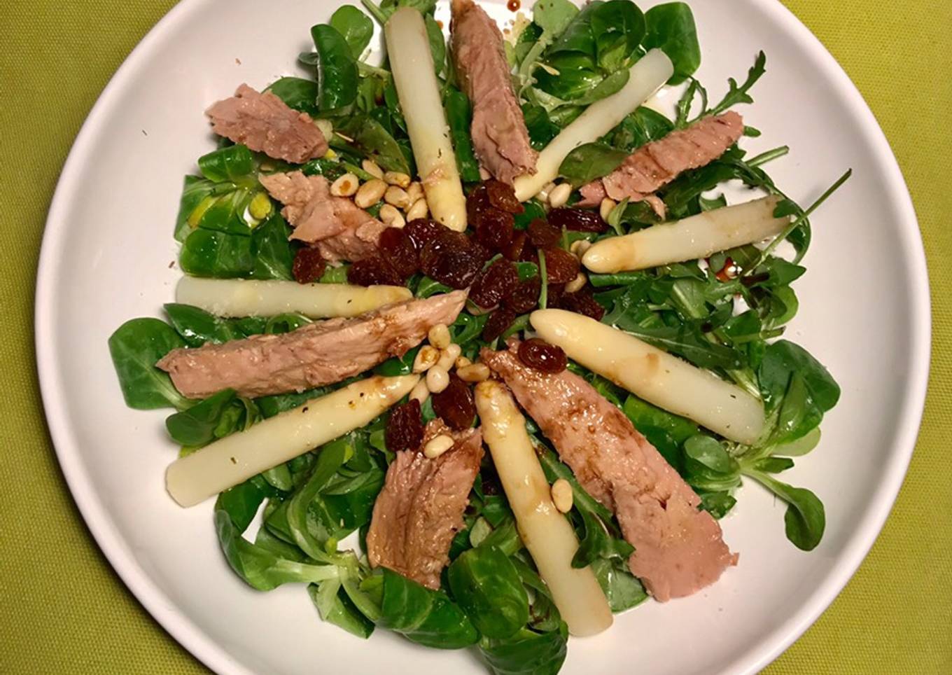 - Coloco los ingredientes en el plato. Ali帽o con unas gotas de bals谩mico de M贸dena, aceite y sal. S贸lo queda comer y masticar despacio