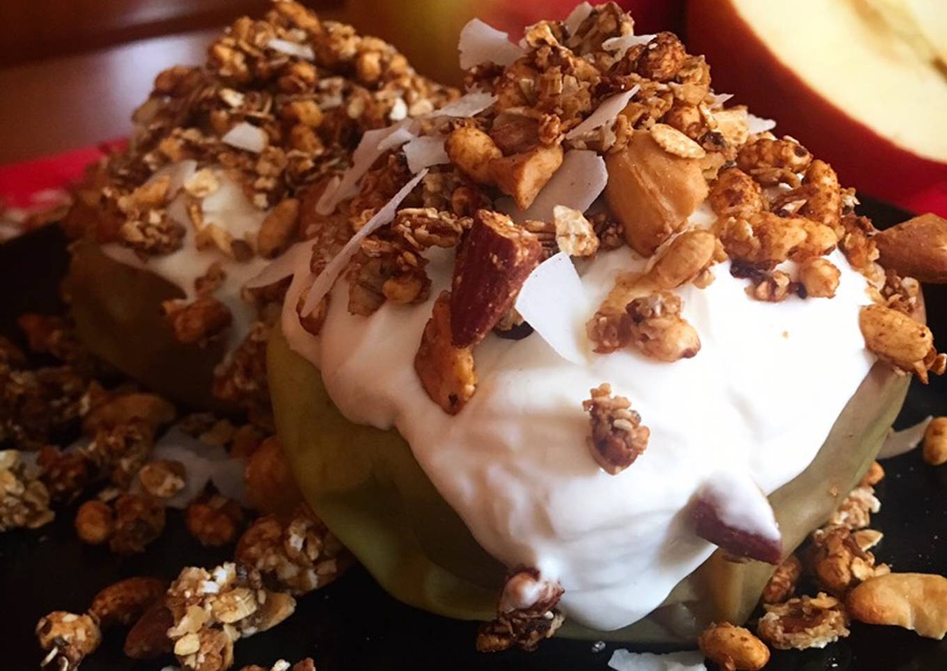 - Os recomiendo meter el yogur en el congelador un rato antes (10 min) para mayor contraste de temperaturas. Vertemos sobre la manzana con la granola casera y listo para disfrutar!