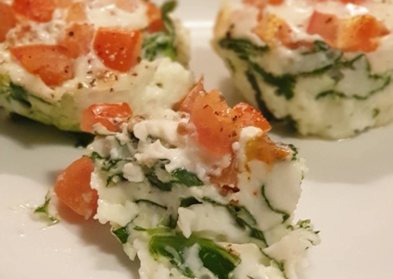 - Poner un fondo de espinacas, encima el tomate picado en cuadraditos y por último la clara de huevo hasta rellenar el hueco