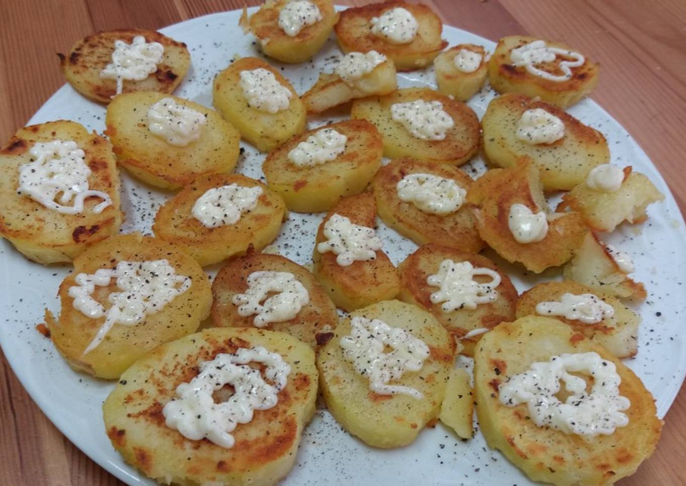 - Colocamos las patatas en un plato y repartimos en alioli al gusto y espolvoreamos pimienta molida.