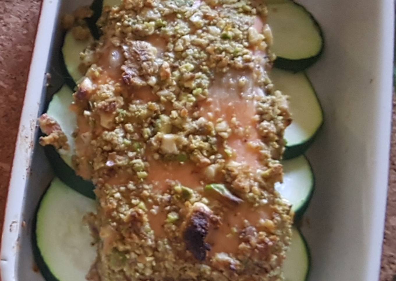 - En la fuente con el calabacín, colocamos encima la pieza de salmón con los frutos secos y metemos al horno otros 10 minutos.