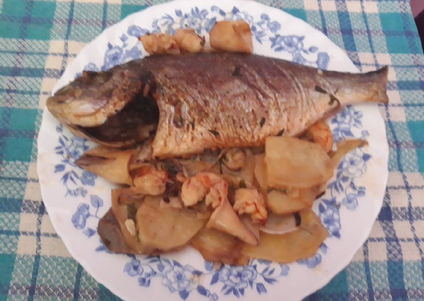 Dorada al horno con almejas, gambón, patatas y chipirones
