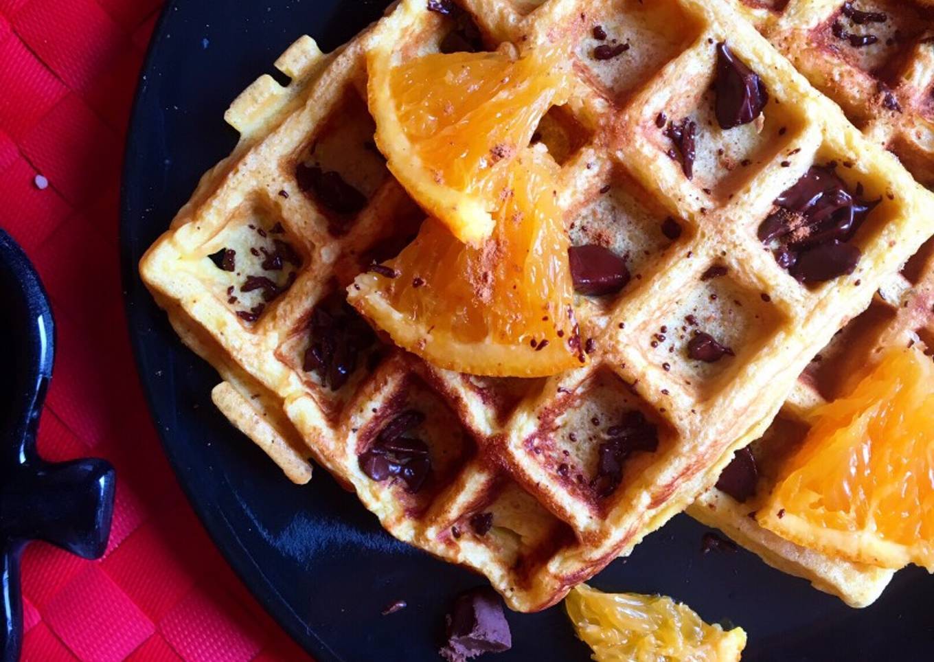 - Engrasamos la gofrera con un poco de aceite de coco para que no se peguen, precalentamos, preparamos los gofres, troceamos la onza de chocolate por encima y listo!