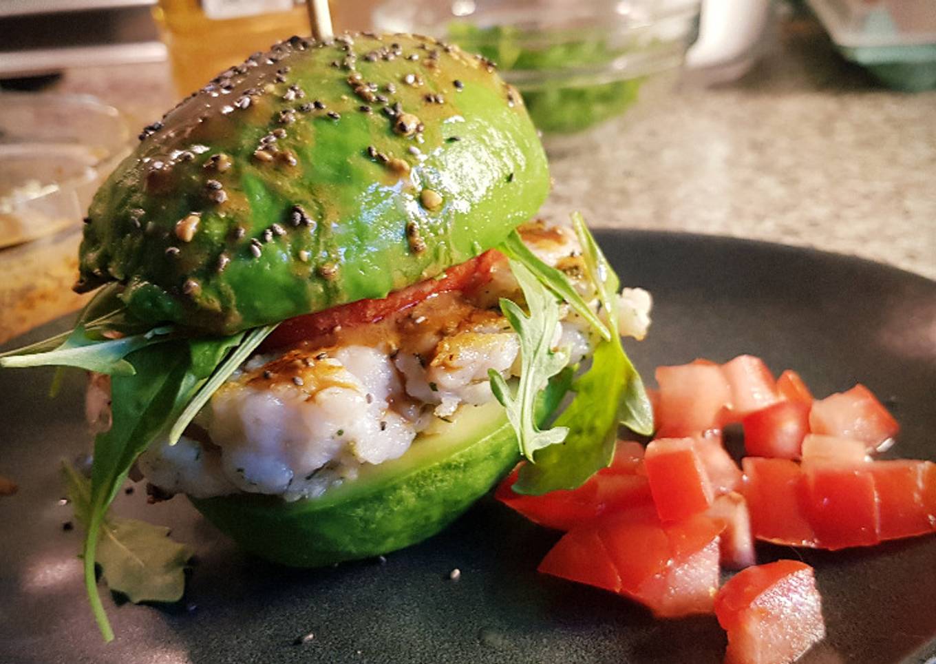 - Montamos la hamburguesa de la siguiente manera. Una mitad de aguacate. Encima la hamburguesa, un poco de vinagreta, la rodaja de tomate, unas hojas de rúcula, otro poquito de vinagreta, la otra mitad de aguacate y otro poquito de vinagreta por encima. Acabamos con un toque de semillas de chía.