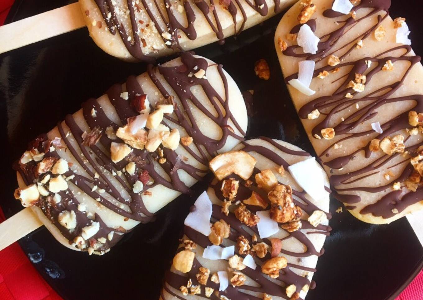 - Derretimos el chocolate con el aceite de coco en el micro, vertemos con una cuchara sobre los helados, espolvoreamos nuestro toque crunchy antes de que se solidifique y listos para disfrutar!