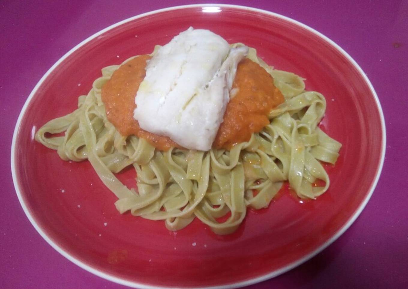 Nidos verdes con salsa de verdura, tomate y merluza al vapor