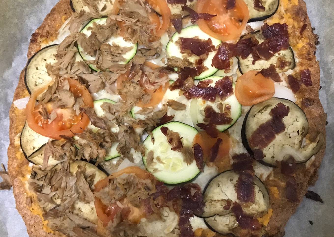 - Luego preparé unas rodajas de berenjena, calabacín, un poco de jamón, cebolla y atún.