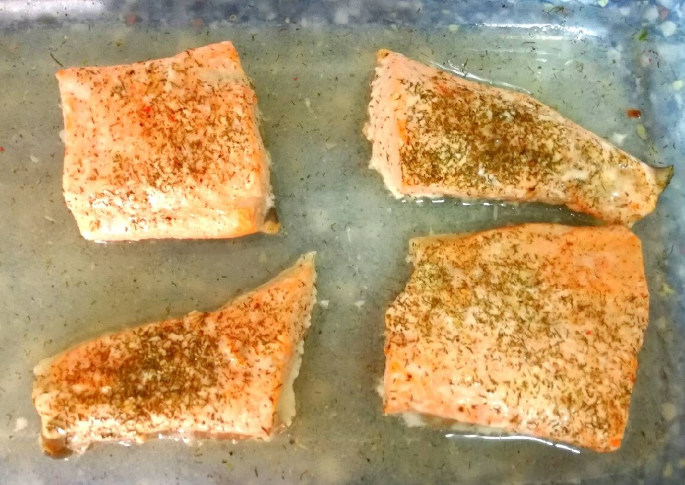 - Vierte un vaso de vino para cocinar en una fuente de cristal, colocando encima los lomos de salmón (dales vuelta y vuelta sobre el vino para que se empapen bien)