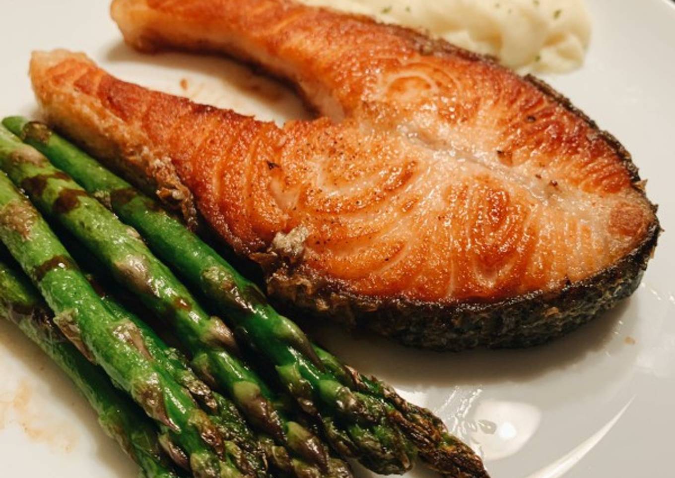 Salmón a la plancha con trigueros salteados y puré de patatas