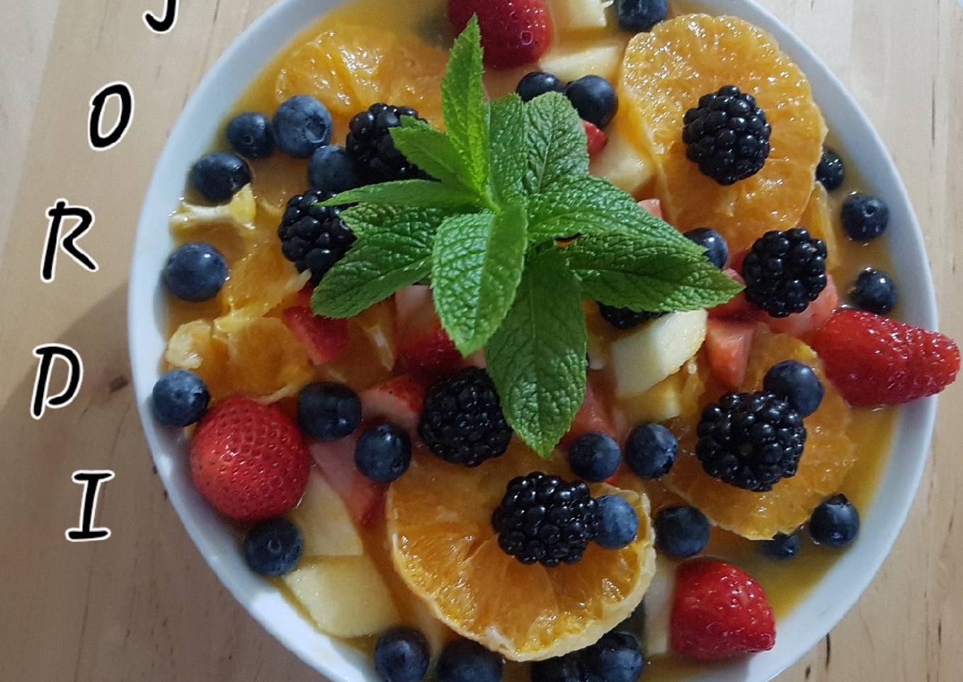 - Hacemos zumo con las 3 naranjas y lo dejamos en la nevera para que se enfríe, Troceamos el plátano, las manzanas la naranja de postre y algunas fresas, mezclamos y echamos el zumo de las naranjas algo enfriado, decoramos encima con el resto de fresas los arándanos y las moras.