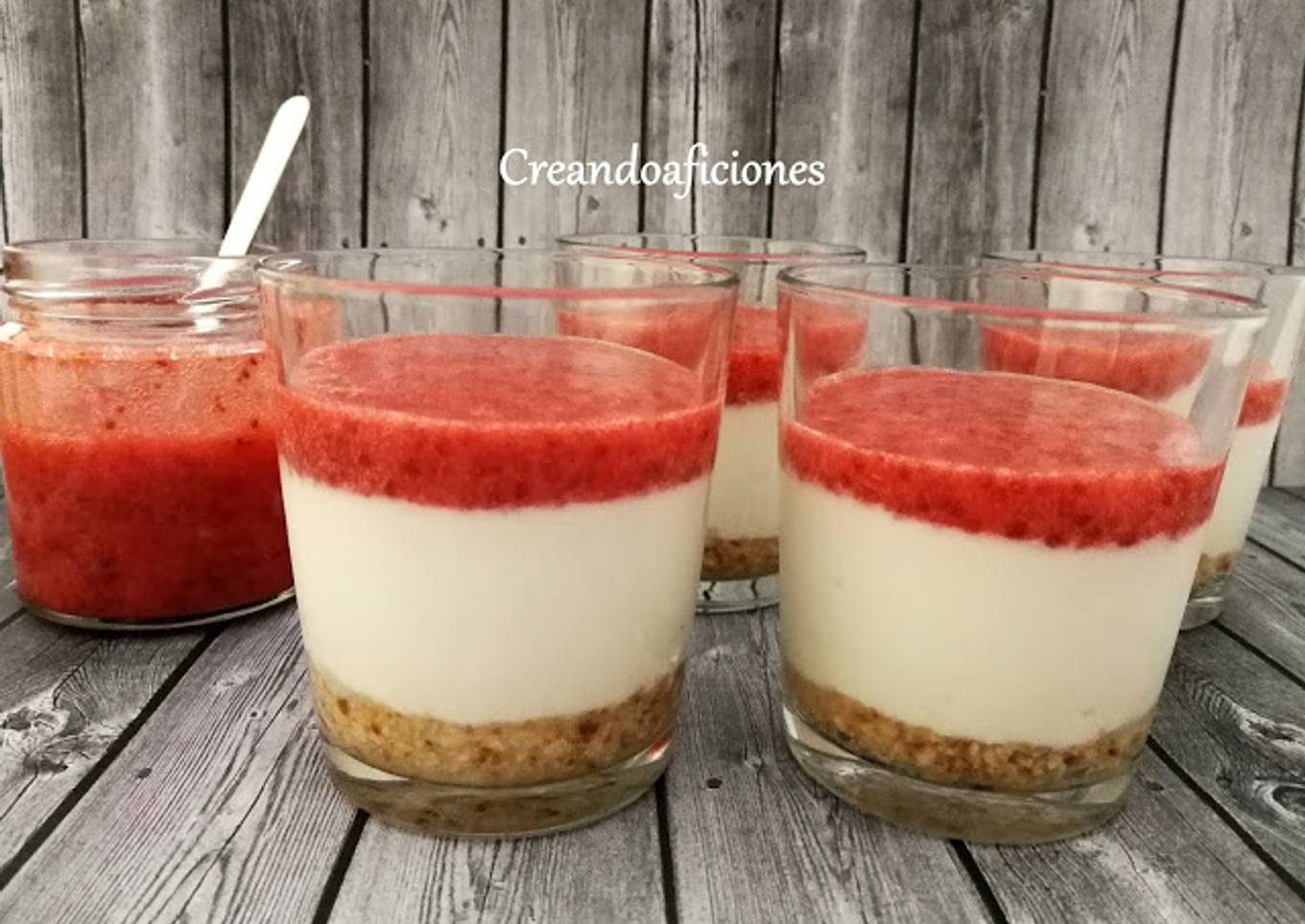 - Cogemos los vasos y echamos el queso fresco batido encima de la base.
