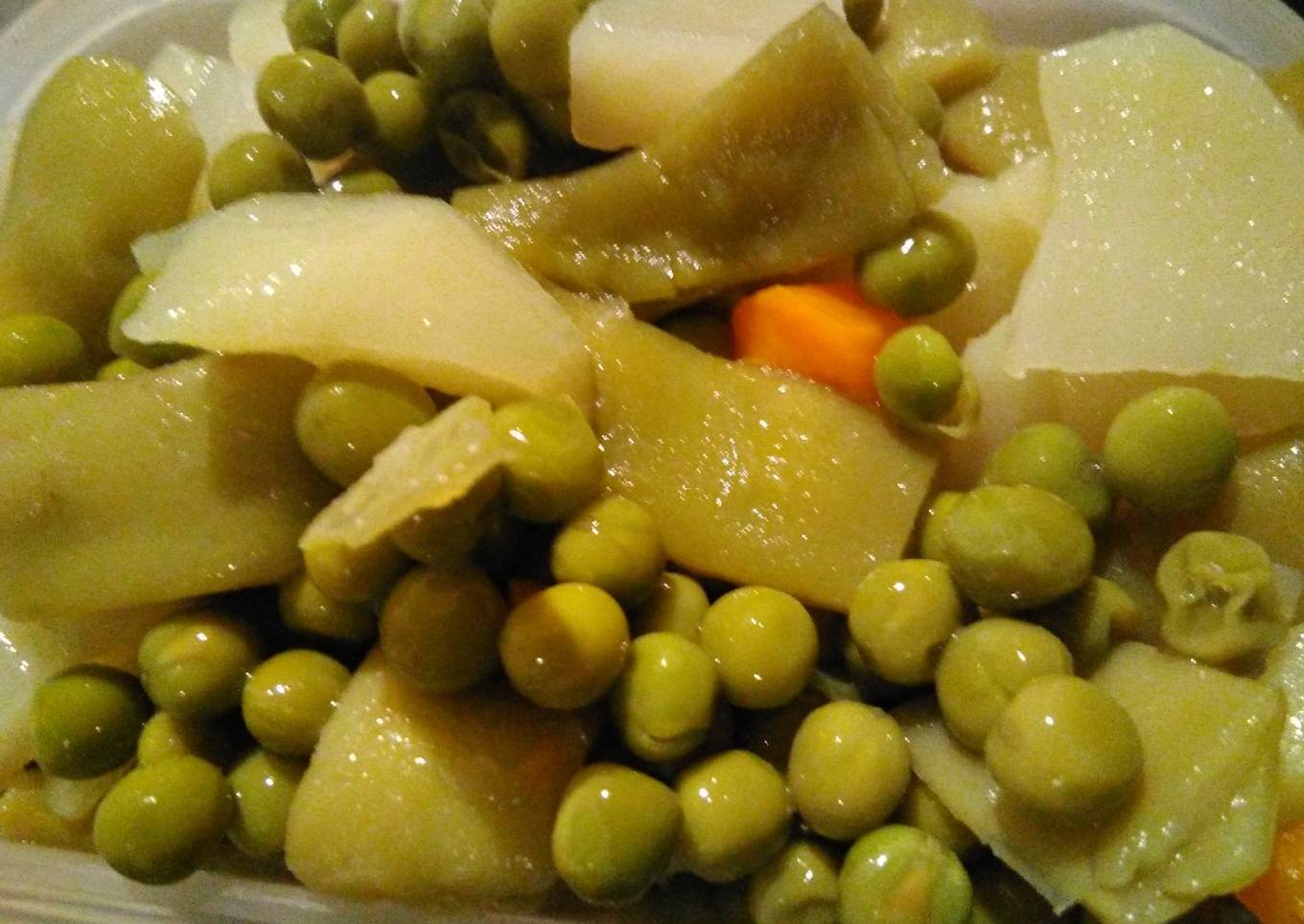 - Añadimos guisantes, zanahoria y patata (pelada y troceadas). También le echo en ocasiones brócoli