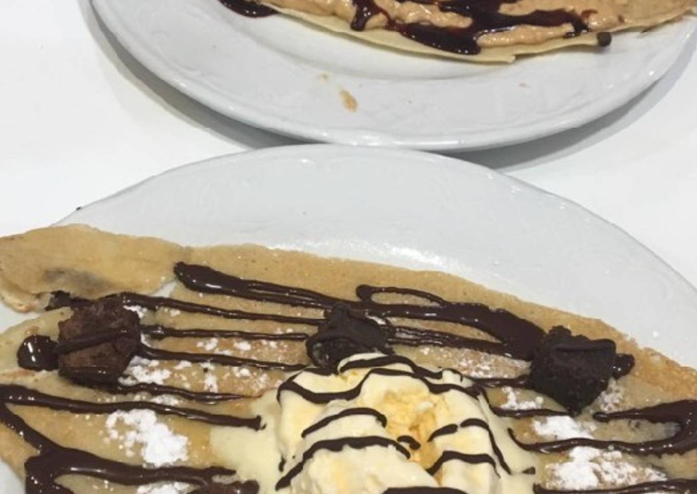 - En una sartén untamos con aceite el fondo para que no se peguen. Cuando esté caliente añadimos un poquito de la mezcla y al minuto le damos la vuelta. La sacamos y la rellenas (en mi caso de nutella) la doblamos la ponemos sobre el plato con un chorro de chocolate y una bola de helado.