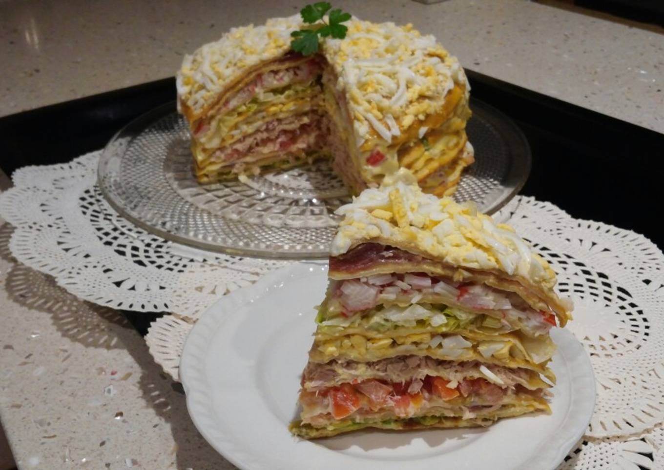- 7a capa: crêpe, mayonesa y palitos de cangrejo.