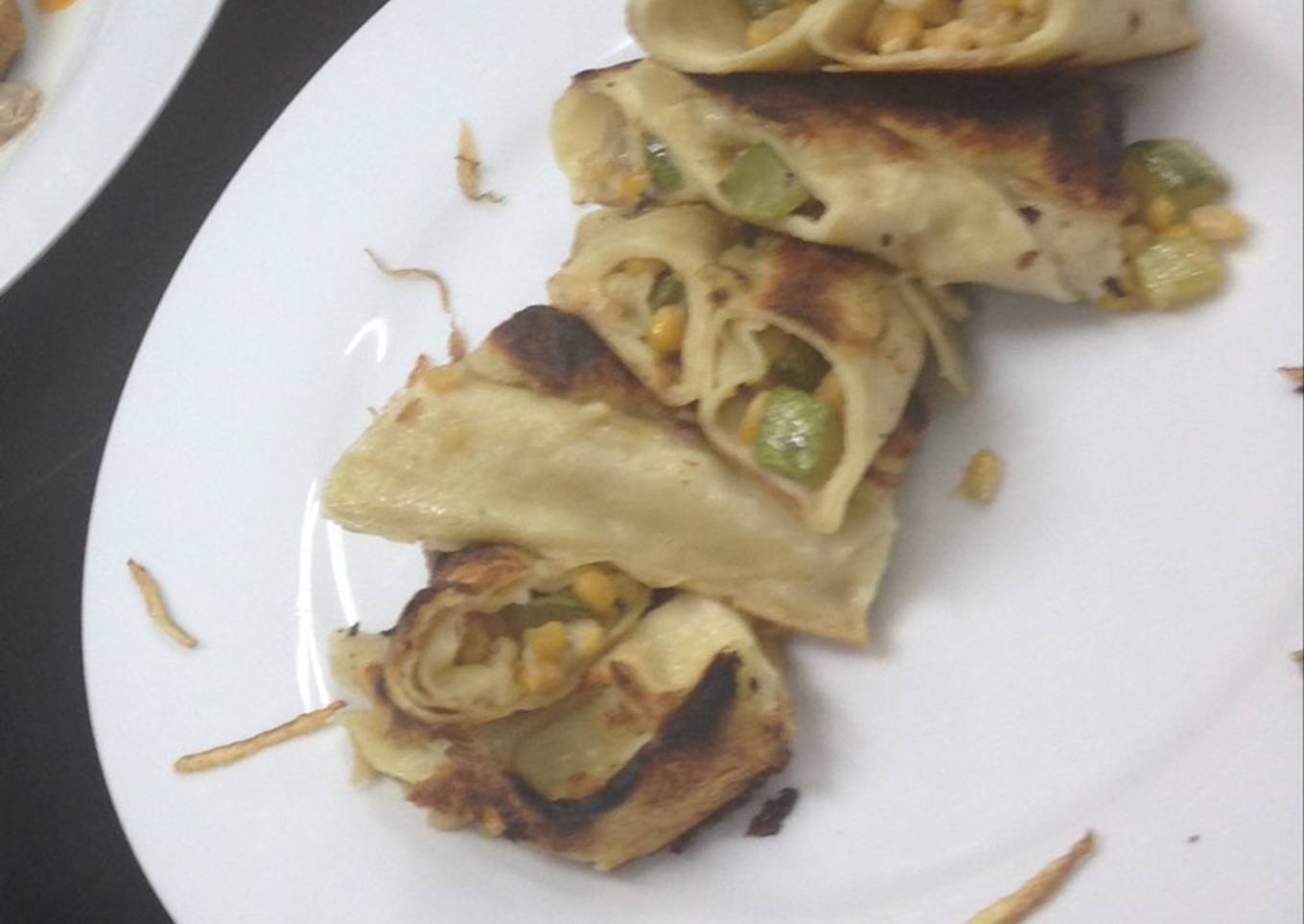 - Luego, agarras una creps y la rellenas con el maíz y la cebolla y enrollas la creps. A degustar
