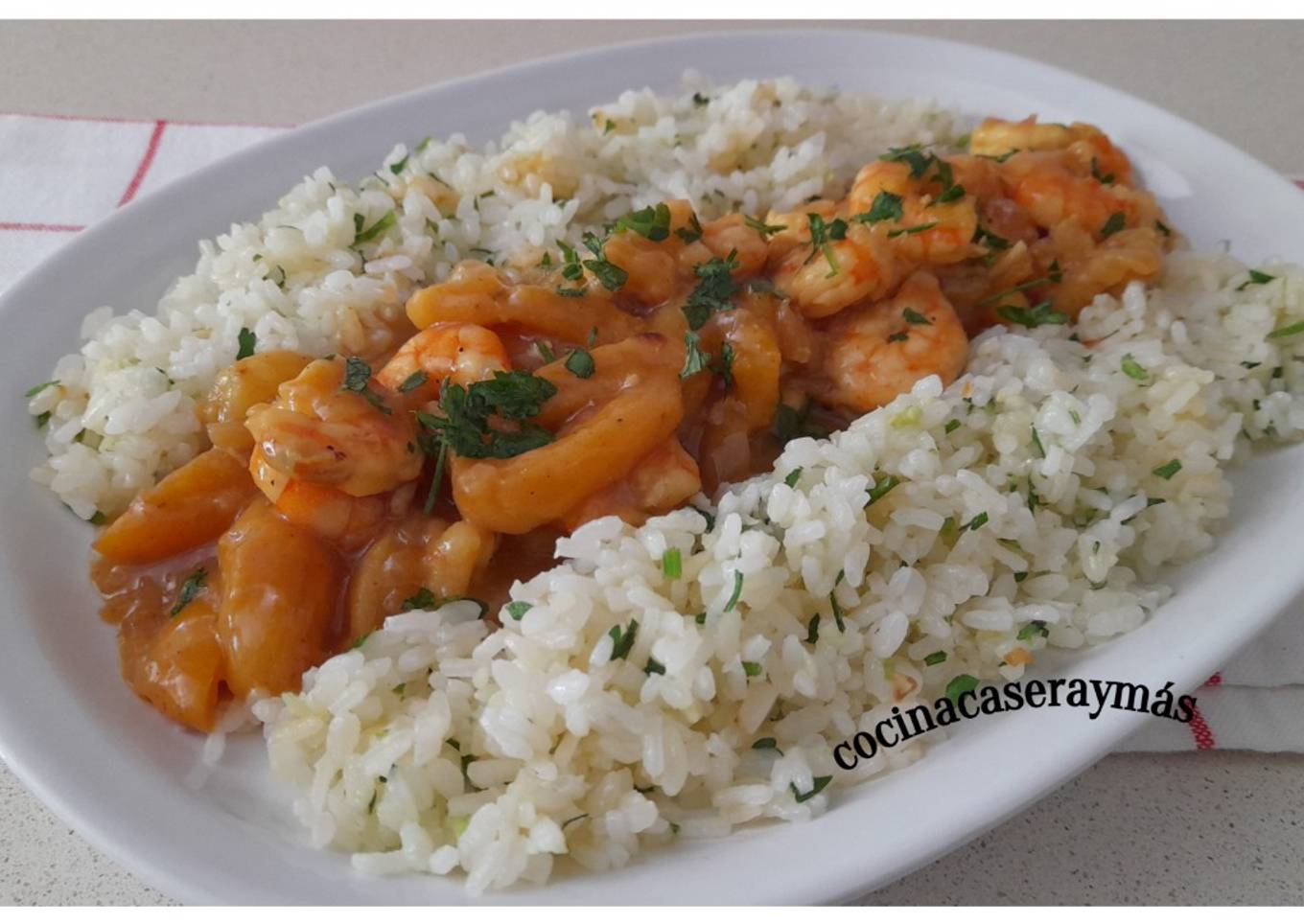 - Presentamos el plato con los langostinos y el arroz.