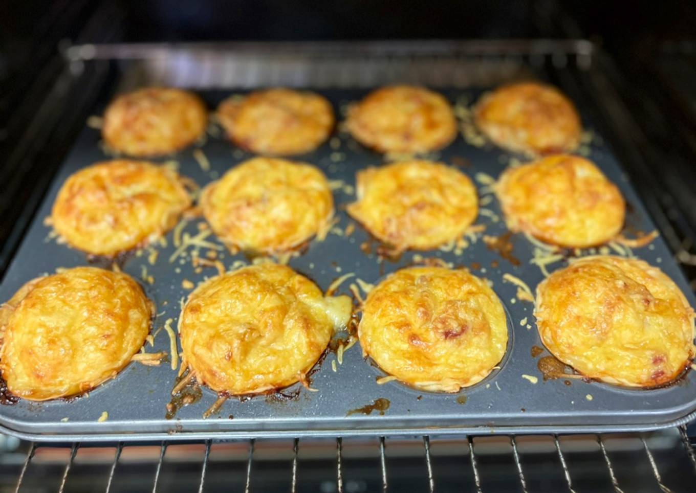 - Añadir la Nata y pimienta y terminar de batir. Poner las obleas en la fuente de magdalenas y rellenar con la mezcla. Cubrir con el queso rallado.