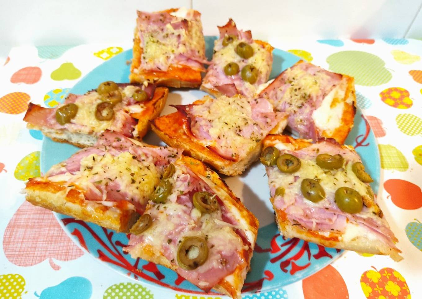 Cortamos en horizontal la barra y la humedecemos con un poquito de agua por la parte de abajo. - En una fuente para horno cubierta con papel vegetal ponemos el pan. Extendemos un chorro de tomate frito con ayuda de una cuchara añadimos unas lonchas de queso, jamón de York... Agregamos el queso rallado, aceitunas cortadas y orégano al gusto.